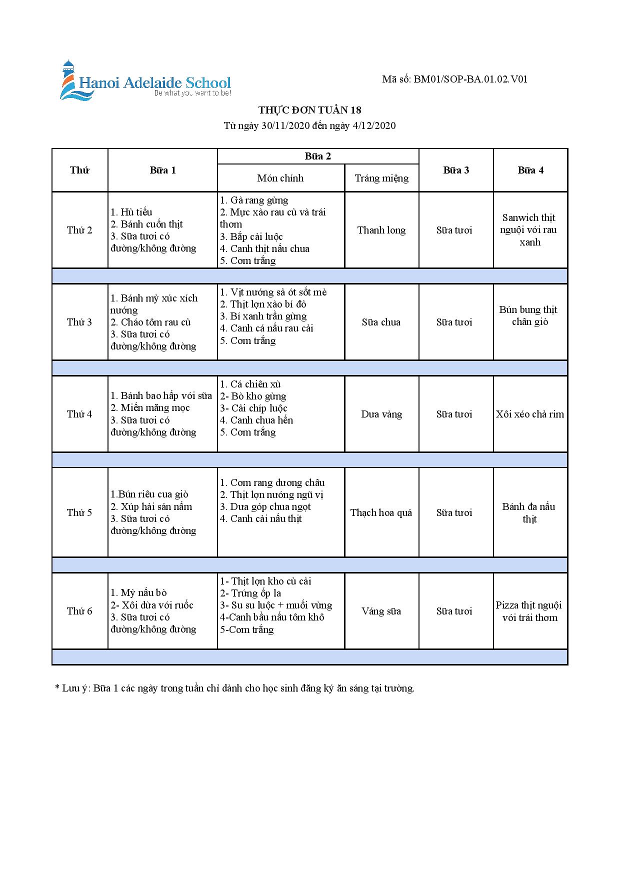 Thực đơn (Từ ngày 30/11/2020 đến ngày 4/12/2020)