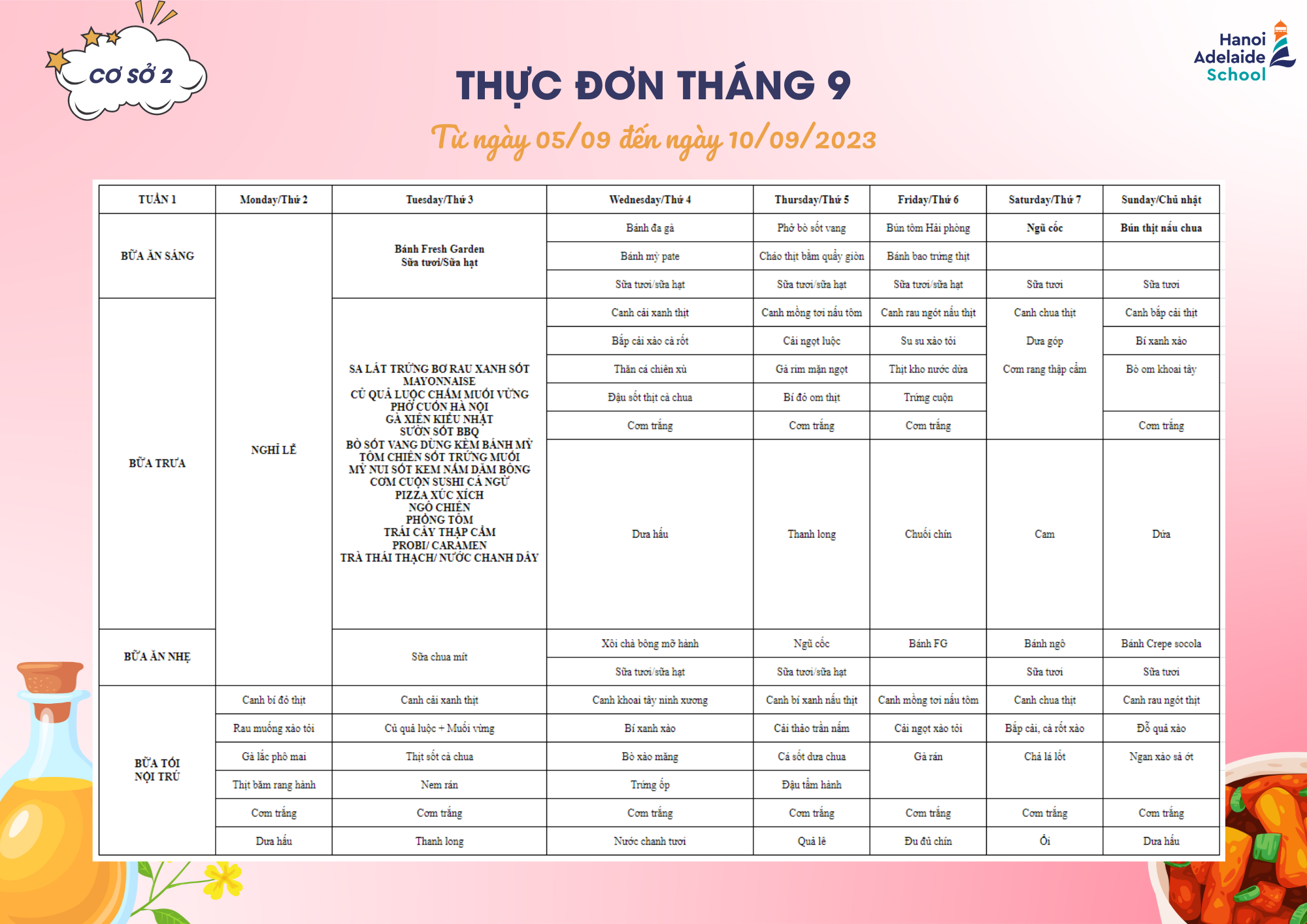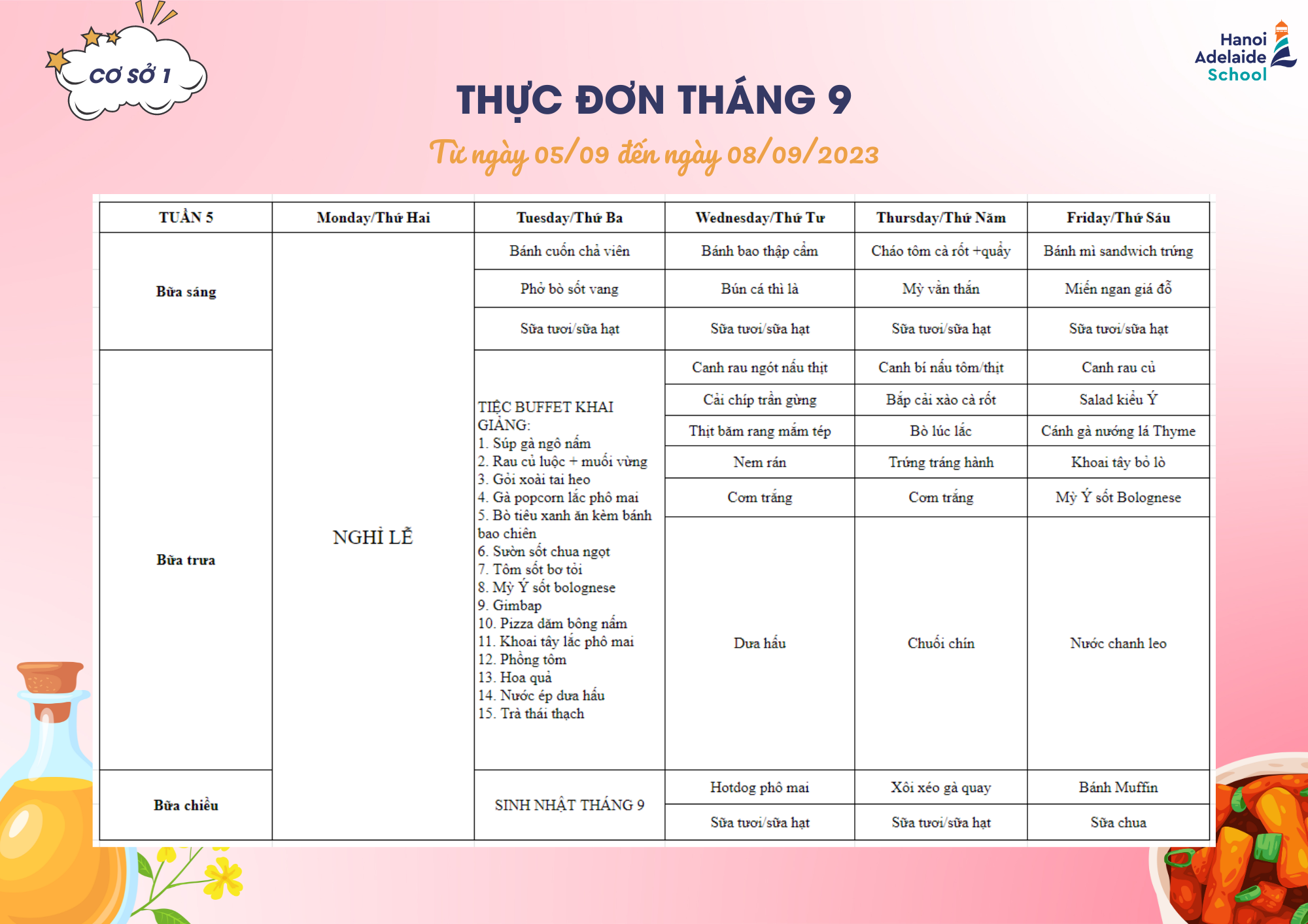 Thực đơn từ ngày 5/9 đến ngày 10/9/2023