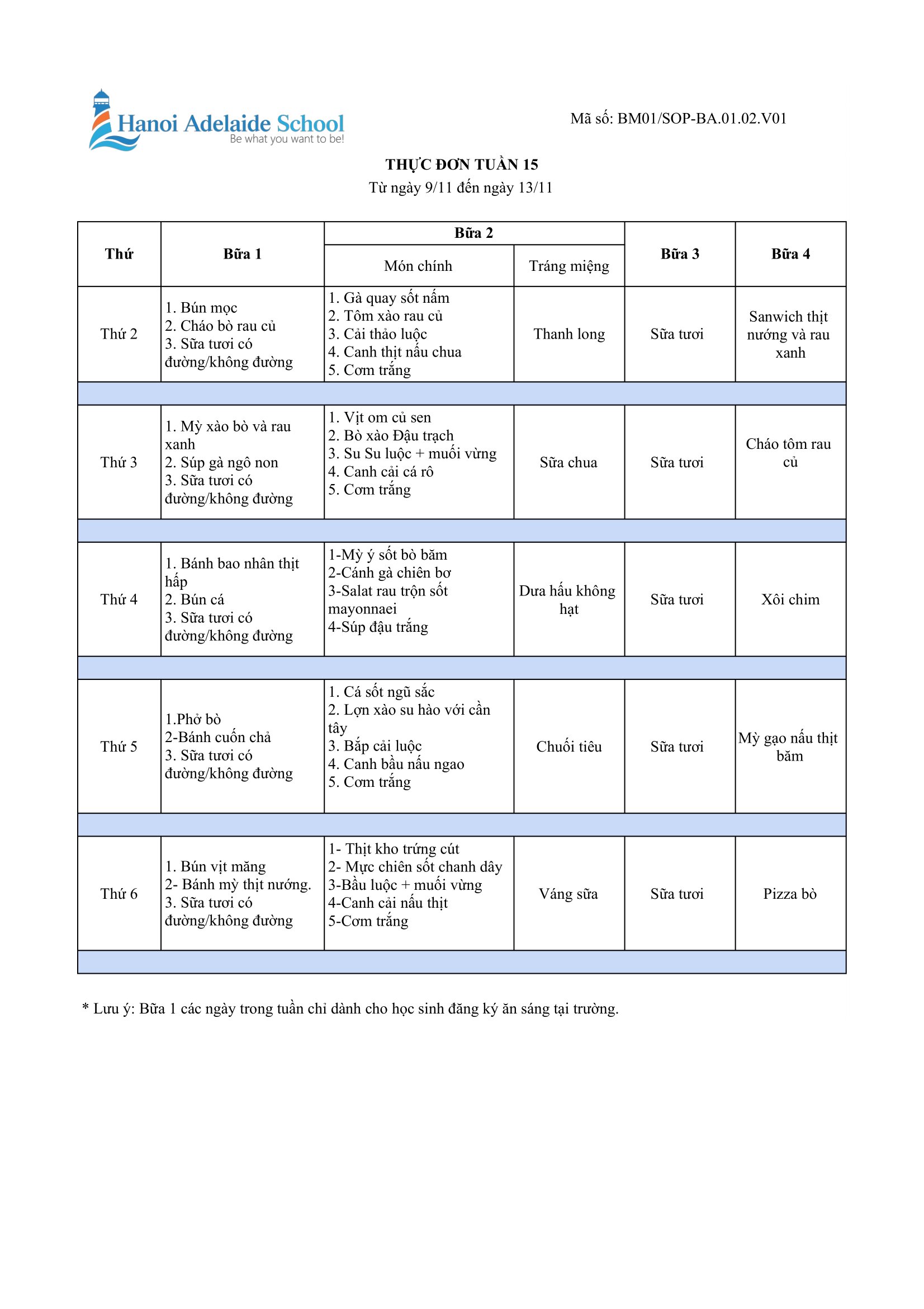 Thực đơn (Từ ngày 9/11/2020 đến ngày 13/11/2020)